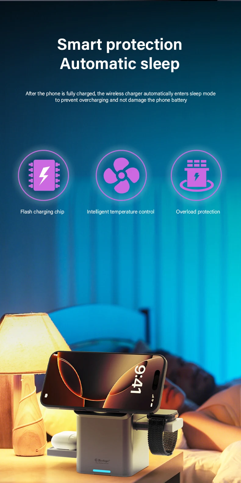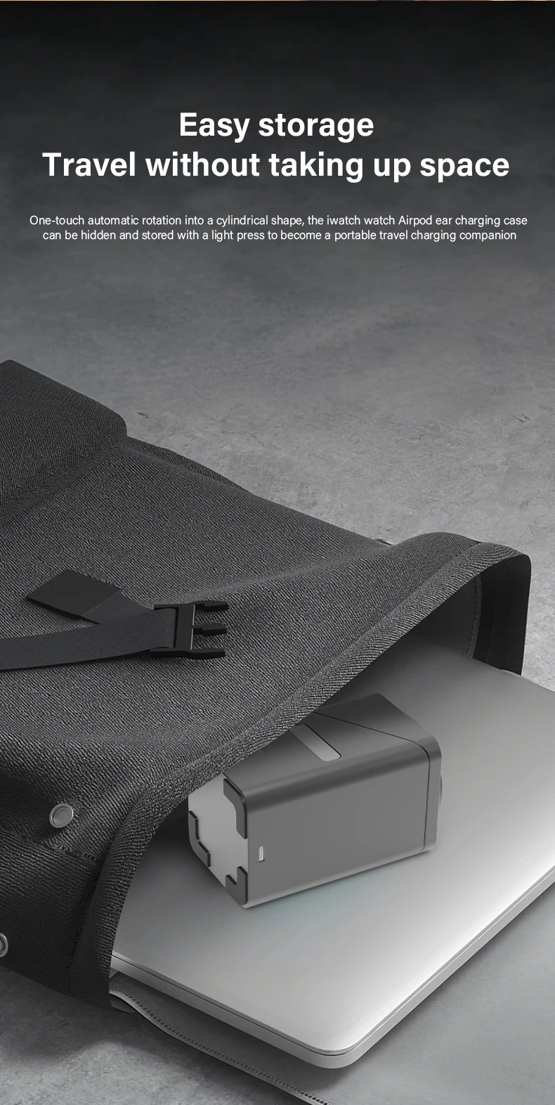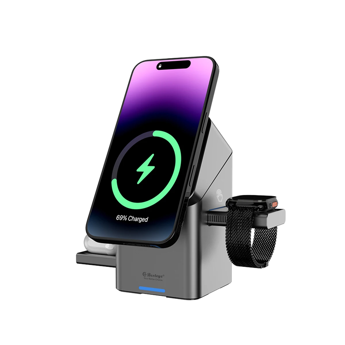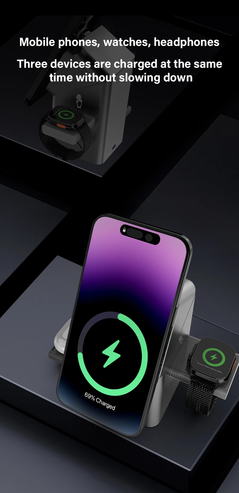 Experience Efficiency with the 3-in-1 Wireless Charger Introducing the revolutionary 3-in-1 Wireless Charger — your ultimate solution for seamless charging! Designed to accommodate your iPhone, Apple Watch, and AirPods with unmatched convenience, this foldable charger elevates your tech experience. Say goodbye to tangled cords and cluttered spaces with this innovative charging stand.
