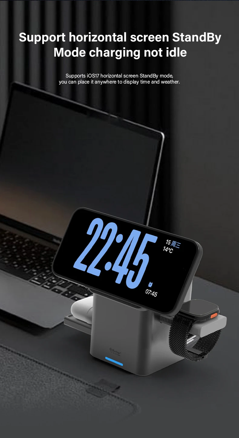 3-in-1 Functionality: Charges your iPhone, Apple Watch (1-8/Ultra), and AirPods Pro simultaneously.