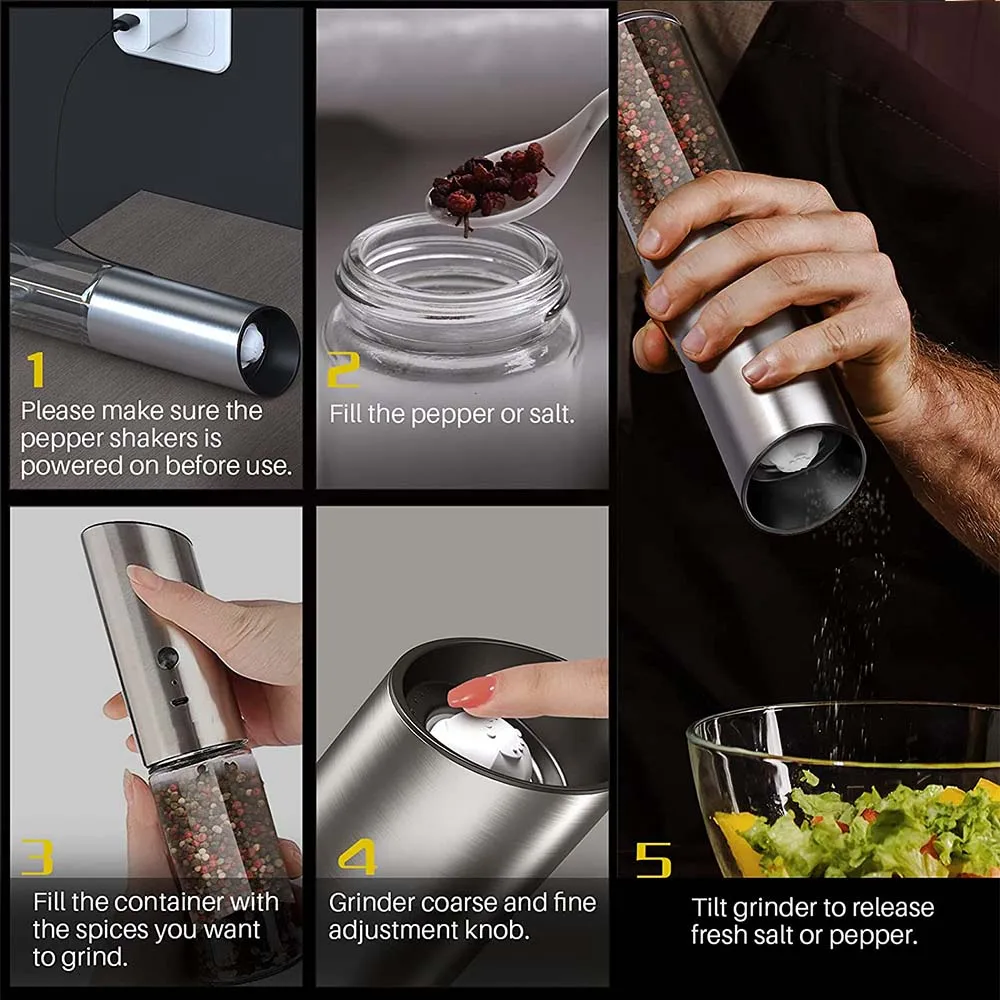 • Electric Powered :This salt and pepper grinder set is powered electrically, making it convenient and easy to use. No need for manual grinding, saving you time and effort.